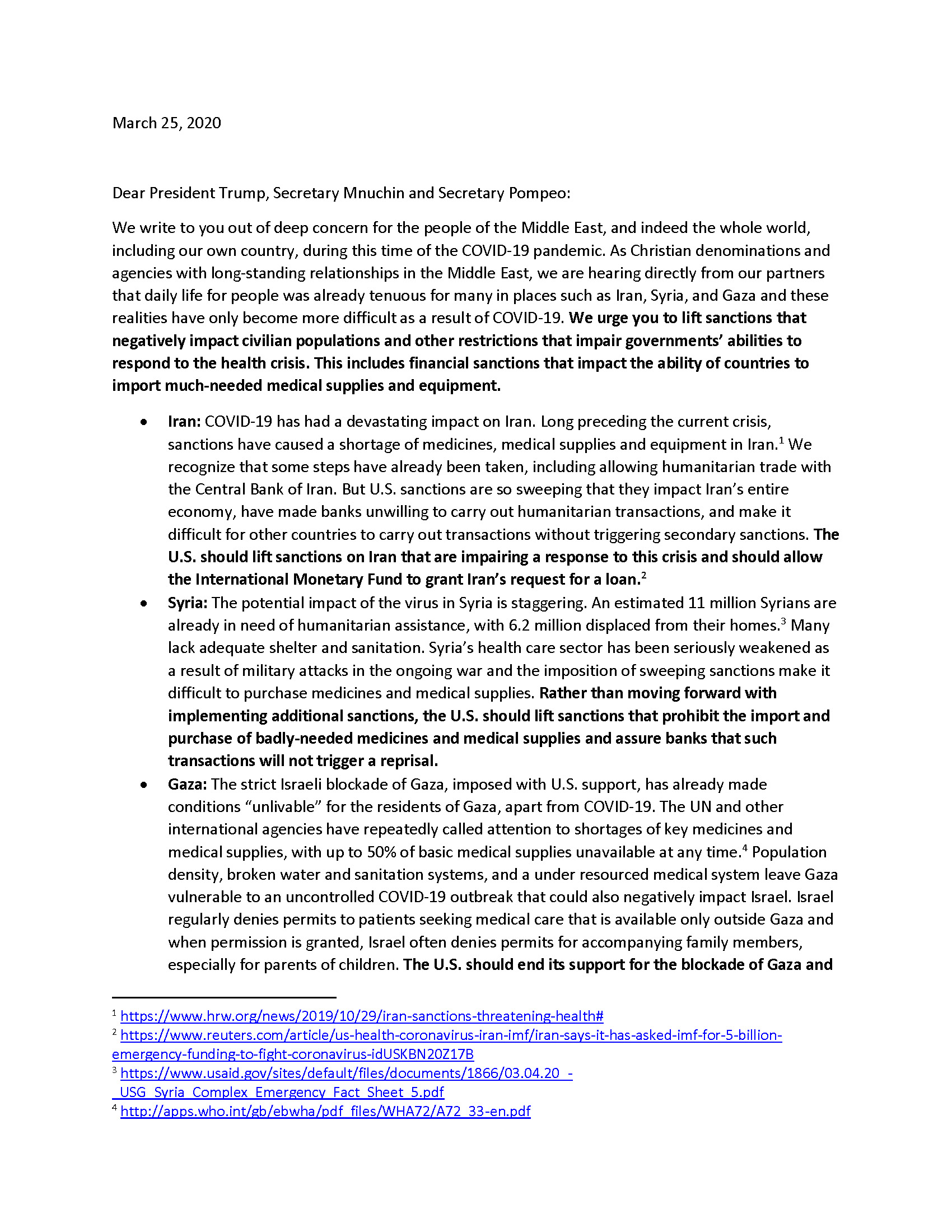 لازم به یادآوری است که در پی درخواست اسقف اعظم سیبوه سرکیسیان خلیفه ارامنه تهران پدر آلابونی به همراه مسئولان کلیساهای انجیلی آمریکا با ارسال نامه ای به دونالد ترامپ رئیس جمهوری آمریکا و مایک پمپئو وزیر امور خارجه این کشور خواستار لغو تحریم های اعمال شده علیه ایران و همچنین سوریه و غزه جهت کمک به مبارزه علیه شیوع ویروس کرونا شده اند.